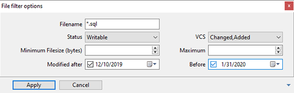 現(xiàn)在,您可以根據(jù)名稱,大小,日期,只讀狀態(tài)和版本控制狀態(tài)來過濾文件。 您可以在選項(xiàng)對話框中指定過濾器: