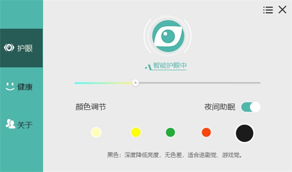 軟件有5種智能護眼模式可以調(diào)節(jié),淡黃、黃、綠、紅、黑,五種顏色可選擇,可以開啟夜間助眠,大家可自由調(diào)節(jié)