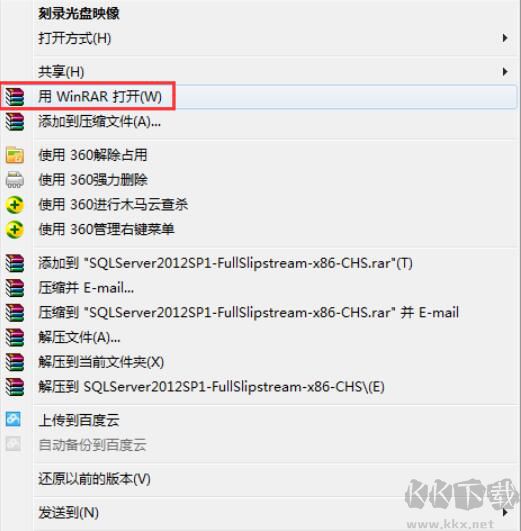 1、鼠標(biāo)右鍵點擊“SQLServer2012SP1-FullSlipstream-x86-CHS”鏡像文件,然后點擊“用WinRAR打開”