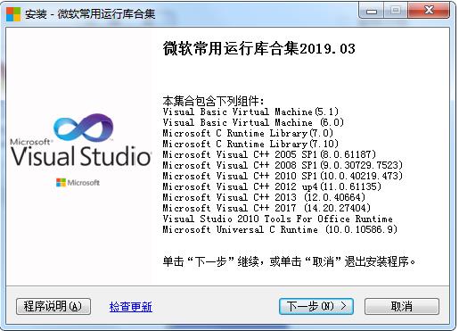 給大家分享最新的VC運行庫合集,該合集安裝包包含了我們系統(tǒng)必備的Windows常用VC運行庫,包含vc++2005、VC2008、VC2010、VC2012、VC2015、VC2017 64位和32位等最新版,都是微軟官方提取整合,通過微軟數(shù)字簽名,一鍵即可幫助你安裝完所有運行庫。(可自動檢測跳過已經(jīng)安裝的版本)