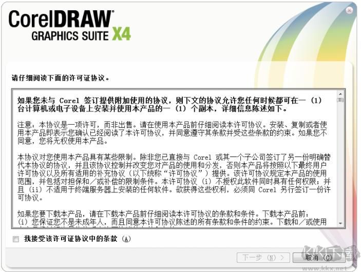 2.加載完畢進(jìn)入到CorelDraw X4的安裝協(xié)議界面,小編建議大家大致了解下CorelDraw X4的安裝協(xié)議,因?yàn)樵搮f(xié)議是安裝必須同意項(xiàng)哦。同意協(xié)議后我們單擊【下一步】繼續(xù)安裝。
