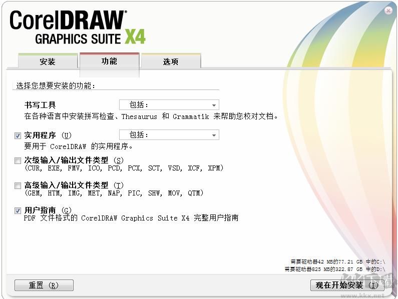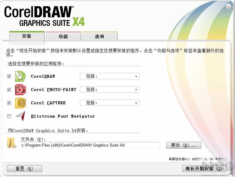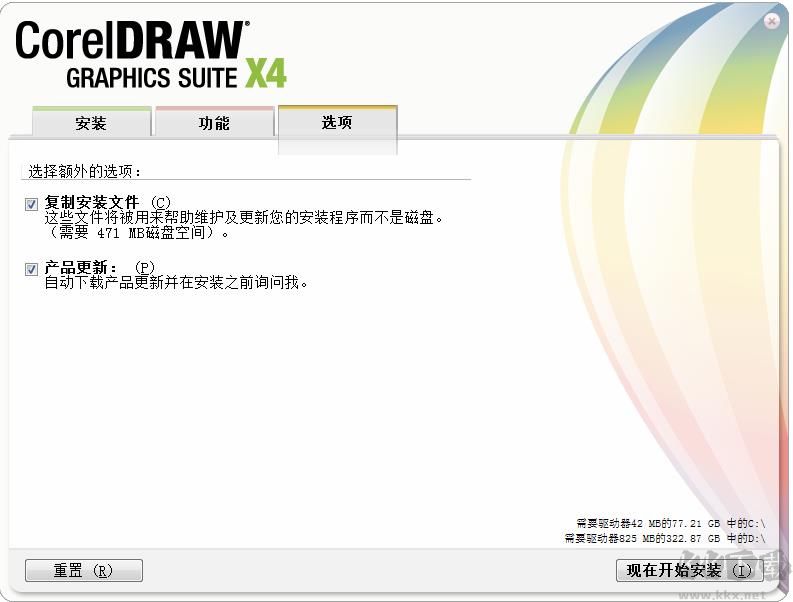 4.繼續(xù)安裝進(jìn)入到CorelDraw X4的附加任務(wù)設(shè)置界面,在這個(gè)界面里分三大模塊,我們先看“安裝”模塊吧。在這個(gè)界面里我們可以選擇CorelDraw X4的其他附加產(chǎn)品,如: