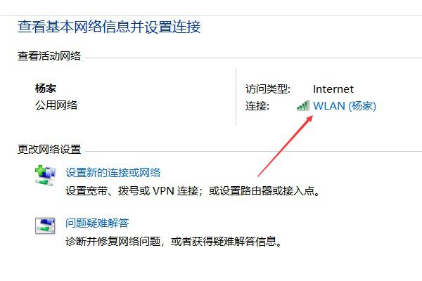 3、在彈出的網(wǎng)絡(luò)和共享中心窗口中點(diǎn)擊【W(wǎng)LAN(wifi名稱)】,如下圖所示: