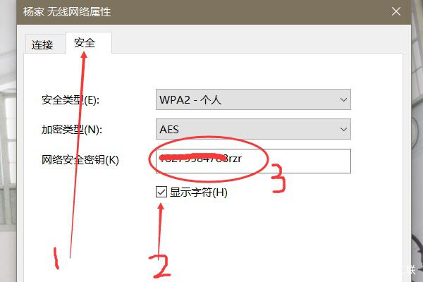 4、在彈出的窗口中點(diǎn)擊【無線屬性】,然后在彈出的新窗口中點(diǎn)擊【安全】選項(xiàng)卡,將顯示字符勾選上就可以看到當(dāng)前電腦連接的WiFi的密碼了。
