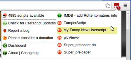 tampermonkey插件使管理您的用戶(hù)腳本變得非常簡(jiǎn)單。位于右上方的tampermonkey圖標(biāo)顯示正在運(yùn)行的腳本的數(shù)量,單擊圖標(biāo)就可以看到正在運(yùn)行的腳本和可能在這個(gè)網(wǎng)頁(yè)上運(yùn)行的腳本。