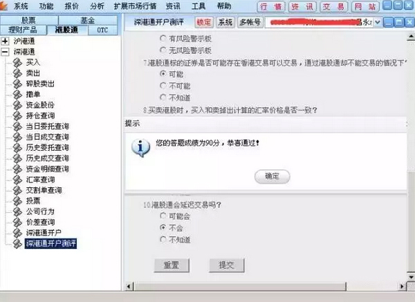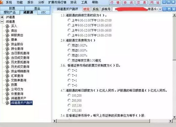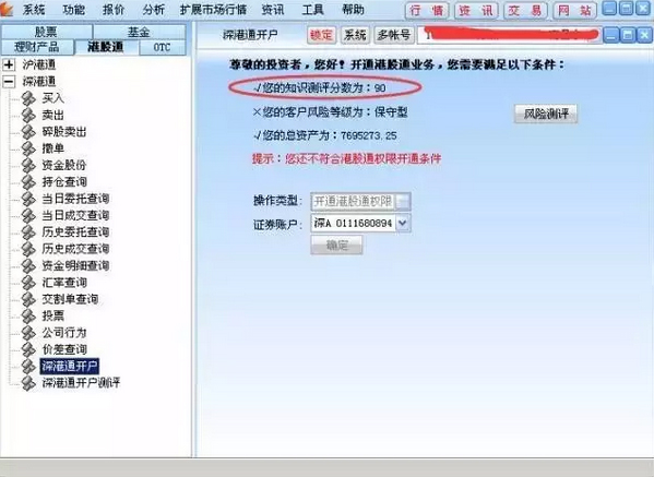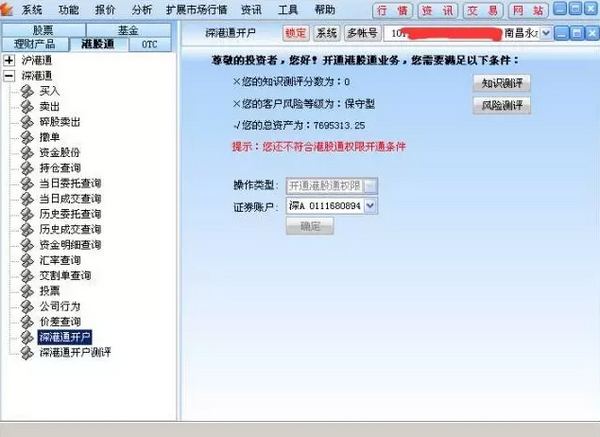 2、登錄軟件后在“港股通”-“深港通”-“深港通開(kāi)戶”菜單可以看到自身?xiàng)l件是否符合深港通開(kāi)戶條件3、可以看到該賬戶只有資產(chǎn)符合要求。但是風(fēng)險(xiǎn)承受能力和港股通測(cè)評(píng)并不符合開(kāi)通港股通權(quán)限所要求的條件