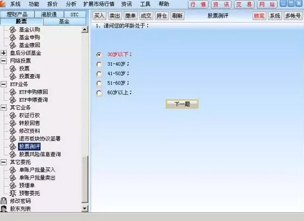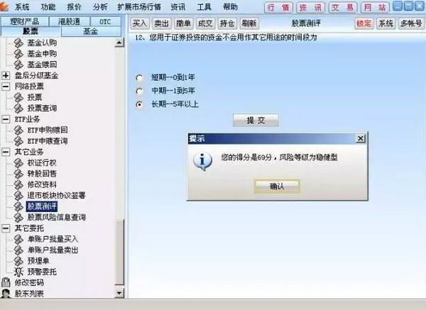 6、點(diǎn)擊“風(fēng)險(xiǎn)測(cè)評(píng)”按鈕,跳轉(zhuǎn)到股票風(fēng)險(xiǎn)測(cè)評(píng)菜單