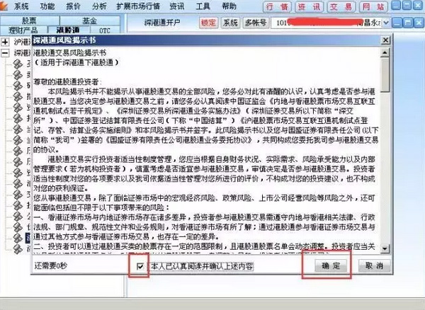 9、點(diǎn)擊確定“確定”按鈕,彈出深港通權(quán)限開(kāi)通協(xié)議,“深港通風(fēng)險(xiǎn)揭示書(shū)”和“深港通委托協(xié)議書(shū)”