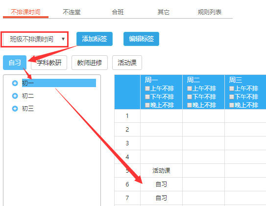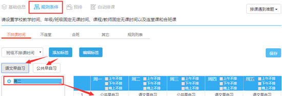 如果需要設(shè)置早晚自習(xí),可以將早晚自習(xí)在基礎(chǔ)信息里和正課進行區(qū)分,并為早晚自習(xí)設(shè)置不排課時間(用來限制早晚自習(xí)的排課節(jié)次)。