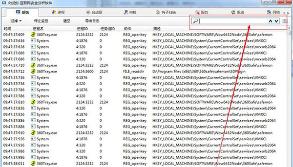 3、如果用戶需要對于特定的關鍵詞進行搜索(包括進程名、動作、結(jié)果等),可以點擊界面右側(cè)的搜索欄進行搜索,直接搜索出自己需要的信息進行調(diào)用。點擊右邊的↑/↓按鈕可以直接查找上一個/下一個相關的數(shù)據(jù),相關項目將會以黃色字體顯示出來。