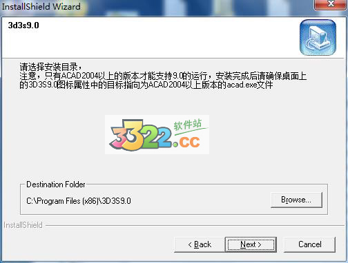 三、選擇3d3s9.0的安裝路徑,默認路徑為C:\Program Files (x86)\3D3S9.0,可默認或點擊Broese更換安裝路徑,完成路徑選擇并點擊Next,如下圖所示:
