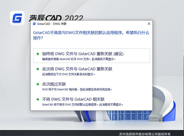 7、此時打開軟件,選擇第一項“始終將DWG文件與GstarCAD重新關(guān)聯(lián)”,如kkx分享的圖片: