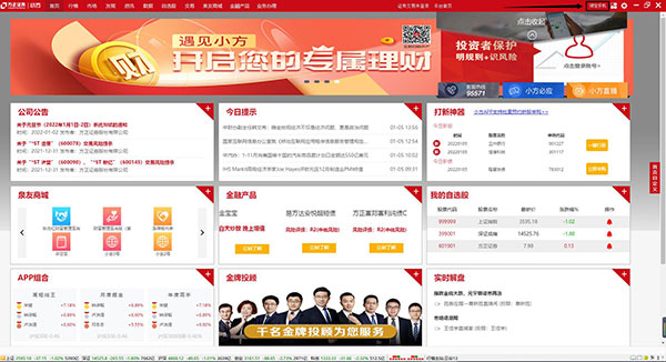 小方證券電腦版是kkx小編給大家分享的親測好用的一款功能全、咨訊更新快、智能分析的功能行情交易PC客戶端,包括行情交易、泉友商城、金融產(chǎn)品、市場全景、發(fā)現(xiàn)事件、資訊頻道、一鍵打新,它可以讓投資者在電腦上隨時(shí)隨地查看股票行情,并進(jìn)行安全交易,絕對是新一代移動(dòng)理財(cái)神器。有了它就等于有專家在你身旁陪你炒股,因?yàn)樗С謧€(gè)股分時(shí)、K線等詳細(xì)指標(biāo),通過這種自定義指標(biāo)公式,您可以用自己的指標(biāo)來分析歷史數(shù)據(jù);通過自定義條件選股公式,您可以選出您想找的股票通過專家系統(tǒng)公式,您可以自己作專家,確定買賣時(shí)機(jī);小方證券,非常不錯(cuò)的證券軟件!