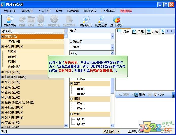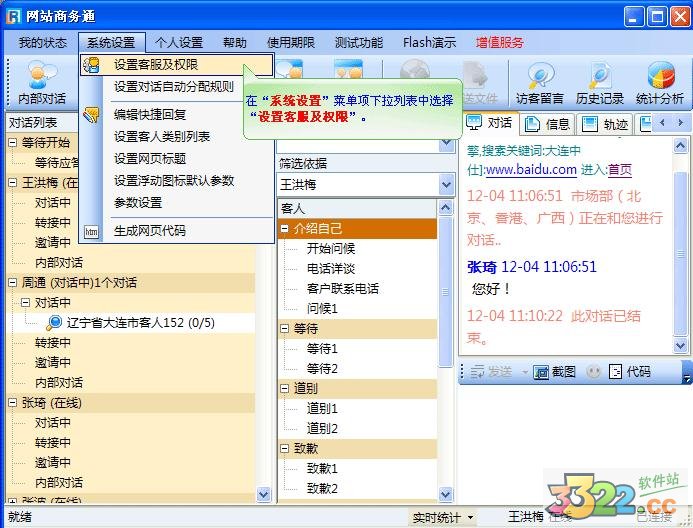 客服管理:商務(wù)通有一個管理員賬號,可以隨時查看每位客服的工作情況、同時可以給客服分配相應(yīng)權(quán)限