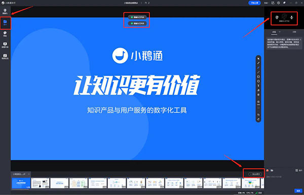 1、第一步,完成視頻直播創(chuàng)建并邀請完講師,然后點擊“去直播”選擇“PC客戶端直播”,根據(jù)Mac、Windows等不同版本,提前下載好小鵝通直播助手客戶端 2、第二步,安裝PC客戶端小鵝通直播助手,講師使用微信掃碼即可登錄,進入直播課程列表 3、第三步,選擇需要直播的課程,點擊右方操作“進入直播”。并對電腦輸出硬件進行測試 4、第四步,選擇想要直播的模式,如課件、畫板或者屏幕共享,這三種模式都可以同時選擇開啟或者關(guān)閉攝像頭,也支持美顏,在客戶端下方開啟或關(guān)閉即可 另外,直播的時候,可以在右上角選擇直播清晰度,右邊是學員的討論區(qū),講師可以在此處與學員進行互動,回答學員的問題 5、第五步,直播結(jié)束之后,點擊右上角的結(jié)束直播,然后會有兩個選擇,直播結(jié)束之后,可以在后臺生成回放,可自行下載下來進行保存或者二次編輯 6、其他提醒:后臺還可以查看本場直播學員的相關(guān)數(shù)據(jù),如學習時長、總學習人數(shù)、最高同時在線人數(shù)、學員的姓名等相關(guān)信息,也可以針對直播做邀請分享排行榜,做直播內(nèi)的抽獎,以及直播帶貨等等,功能很多很強大,各位老師們平時可以多花點時間琢磨琢磨