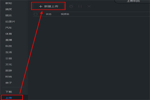 1、打開(kāi)在本站下載站好的優(yōu)酷視頻客戶端后,打開(kāi)軟件后點(diǎn)擊左側(cè)的【上傳】選項(xiàng),然后在選擇【新建上傳】。