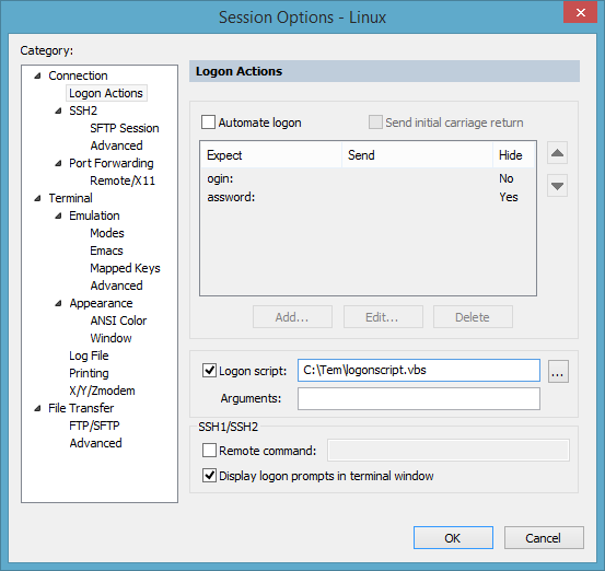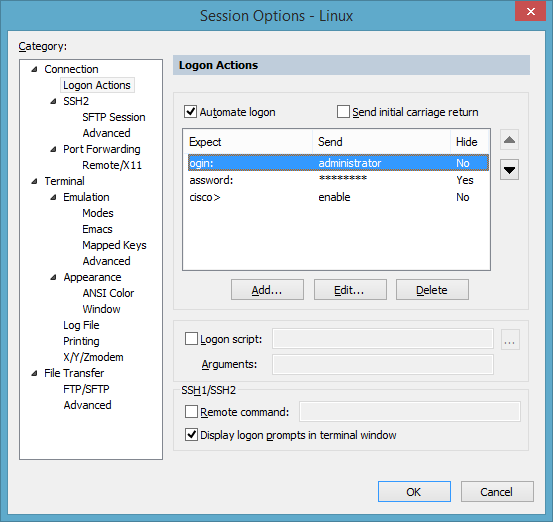 腳本可以在登錄過程中在 SecureCRT 中運行,這意味著,例如,您可以打開腳本記錄器、完成登錄步驟、停止記錄并擁有快速、可重用的腳本。該選項是使用登錄操作類別上的登錄腳本面板 配置的。