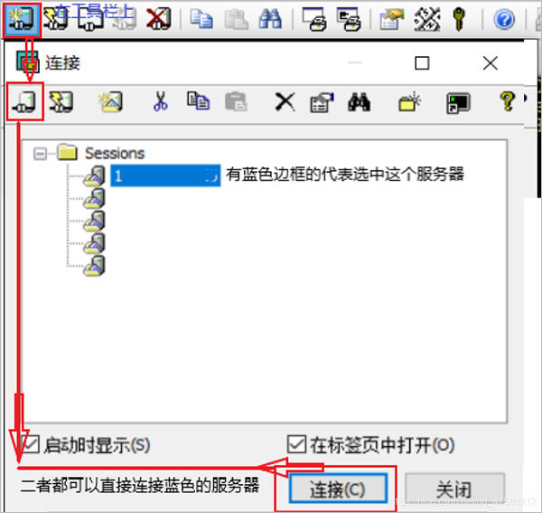 1、選擇下圖【工具欄】的圖標【連接】就會到一個叫做連接的窗口里面有,直接連接的圖標【連接】點擊這個圖標或者下方是【連接】會直接連接藍色已經選中的服務器;