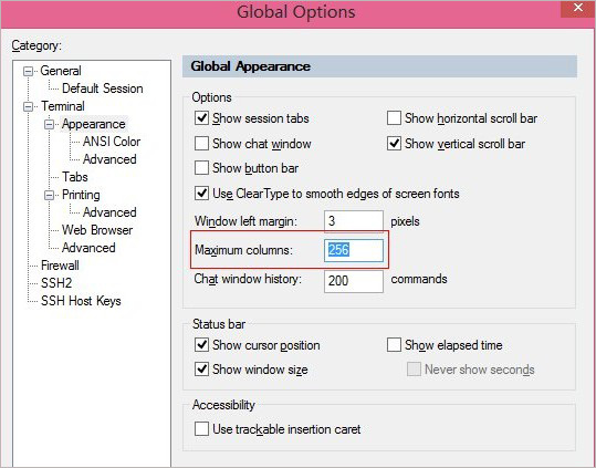 9、大顯示器上若SecureCRT顯示不能占滿整個屏幕,可通過 Global Options/Terminal/Appearance/Maximum columns 來調整: