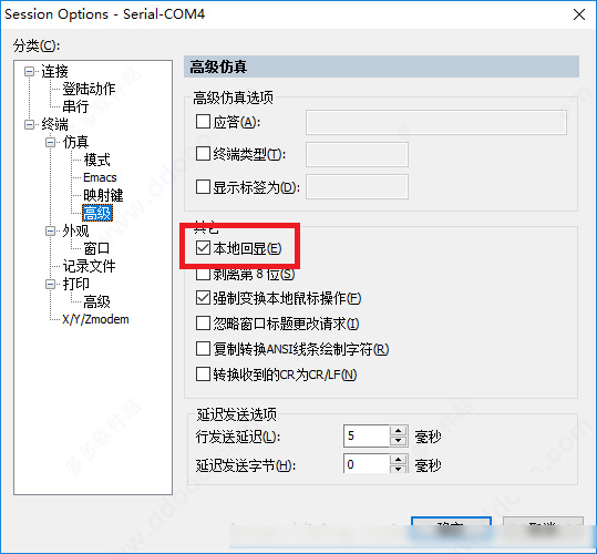 解決辦法:右鍵單擊“Serial-COM4”選項卡,彈出如下窗口,選擇如圖所示串口后,將紅框中的本地回顯開啟即可;