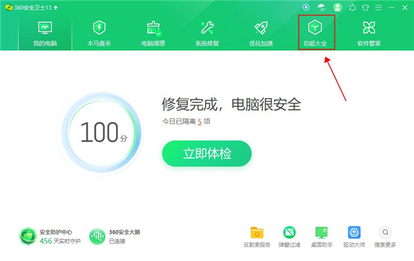 1、打開360安全衛(wèi)士2022最新版進(jìn)入到主界面后,點(diǎn)擊功能大全。