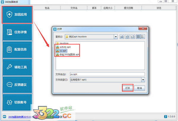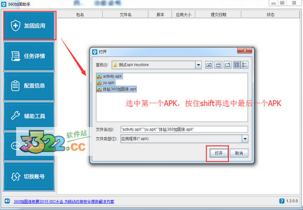 批量加固即一次加固多個(gè)不同APK,共有兩種方法。一是點(diǎn)擊“加固應(yīng)用”按鈕選擇多個(gè)APK,點(diǎn)擊“打開”,如kkx小編分享的圖片: