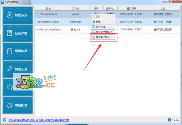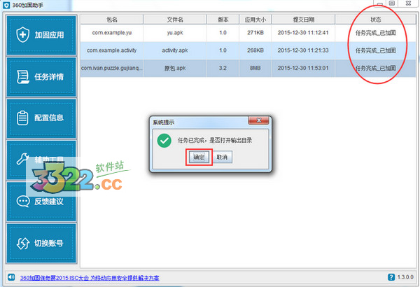 (4)加固完成后彈出提醒框。點(diǎn)擊“確定”打開APK輸出路徑,如kkx小編分享的圖片: