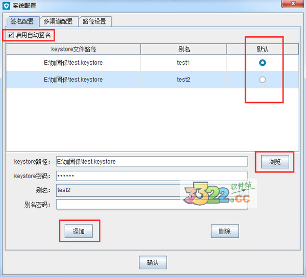 (2)勾選“啟動(dòng)自動(dòng)簽名”,點(diǎn)擊“瀏覽”按鈕,選擇Keystore文件(密鑰倉庫),輸入Keystore密碼,密碼正確后會(huì)顯示別名,然后輸入正確的別名密碼,點(diǎn)擊“添加”,然后單擊“確認(rèn)”或關(guān)閉按鈕即可,如kkx小編分享的圖片: