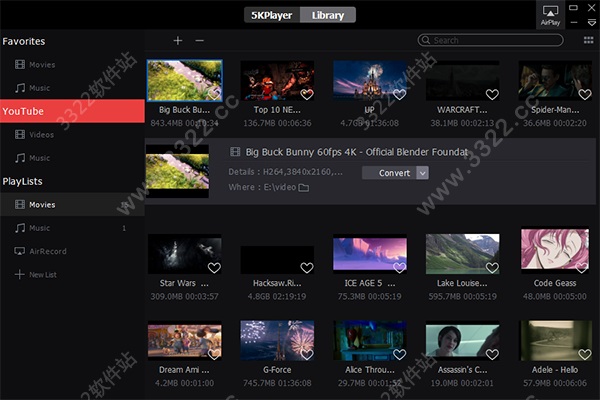 2.除開可播各式各樣新聞媒體檔案資料(包含UltraHD影片、網(wǎng)上影片歌曲、網(wǎng)絡(luò)廣播節(jié)目),免費下載網(wǎng)絡(luò)影片及其通過AirPlay同歩新聞媒體材料外,你們可以在5KPlayer的Library界面內(nèi)迅速創(chuàng)建個人多媒體系統(tǒng)核心。