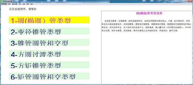 這種類型是矩形管.四個棱錐管和圓管.圓錐管連接的構(gòu)件包括矩形管相交的圓管.四角管與圓管構(gòu)件相交,矩形管與圓錐管相交.斜圓錐管構(gòu)件、四角錐管與正圓錐管構(gòu)件交叉、圓管與四角錐管構(gòu)件直接交叉等6種形式。各部件品種齊全,各部件尺寸齊全.傾斜角度.偏心量可以在一定范圍內(nèi)任意輸入。立體圖附在內(nèi)部.構(gòu)件示意圖.實例參數(shù).展開示意圖和詳細說明,界面友好,操作方便