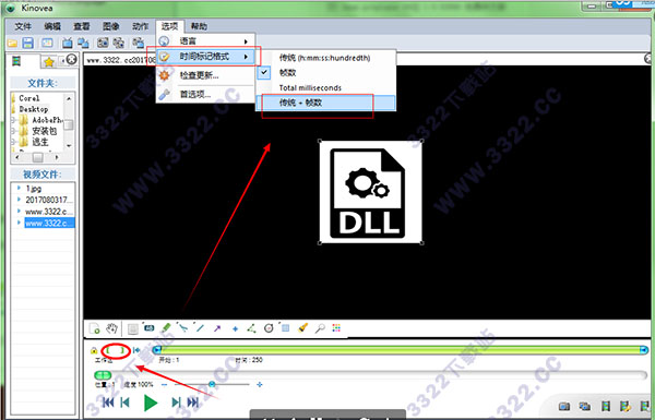 1.時間格式設(shè)置:在菜單欄“選項”—“時間標(biāo)記格式”中,可選擇為“傳統(tǒng)+幀數(shù)”設(shè)置工作區(qū):點擊“【”可將滑塊當(dāng)前位置設(shè)置為第一幀,點擊“】”可將滑塊當(dāng)前位置設(shè)置為最后一幀。(該功能可用于視頻剪切。點擊保存時,所保存的視頻為工作區(qū)內(nèi)的視頻片段。)