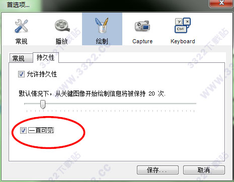 3.這里著重要介紹的是畫筆工具,因為動畫師太經(jīng)常用到它了!在視頻上繪制,播放器會自動記錄一張關(guān)鍵圖像,我們可以在菜單欄“選項”—“首選項”中選擇關(guān)鍵圖像持續(xù)的時間。勾選“一直可見”,則所繪制的圖像會一直持續(xù),如圖所示:
