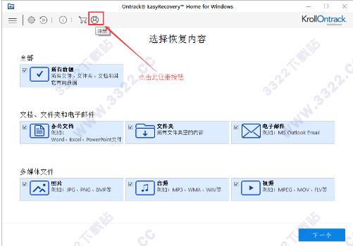 步驟二:選擇恢復(fù)內(nèi)容。打開的軟件主界面如下圖所示,進(jìn)入到選擇恢復(fù)內(nèi)容界面,這里可以選擇恢復(fù)所有數(shù)據(jù),也可以單獨選擇恢復(fù)文檔、郵件、照片或音頻。