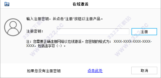 2.在軟件主界面點擊注冊按鈕后,就會彈出如下圖所示的在線激活界面,在注冊密鑰后面的文本框輸入注冊密鑰(數(shù)據(jù)包中有注冊碼),然后點擊注冊。
