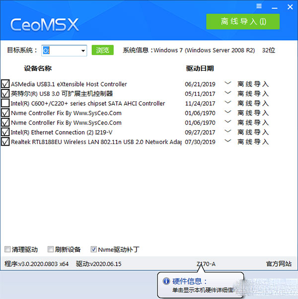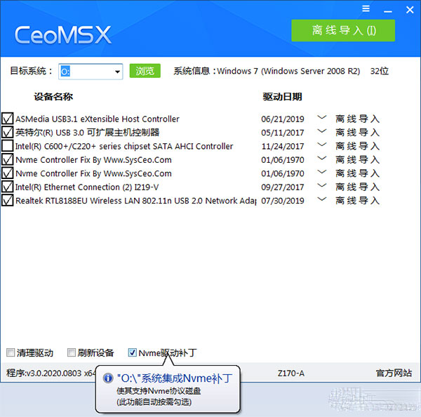 CeoMSX是一款由系統(tǒng)總裁推出的一款專業(yè)的驅(qū)動(dòng)安裝工具,主要功能是幫助用戶給正常系統(tǒng)導(dǎo)入磁盤控制器驅(qū)動(dòng)從而順利安裝系統(tǒng),支持將磁盤控制器驅(qū)動(dòng)導(dǎo)入系統(tǒng)并且順利完成系統(tǒng)的安裝,它支持IDE SAS SCSI AHCI RAID NVME FC Usb3.0 Usb3.1驅(qū)動(dòng)注入,是一款專業(yè)好用的驅(qū)動(dòng)安裝工具!