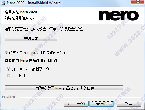 5、之后進(jìn)行軟件安裝設(shè)置,默認(rèn)加入Nero 產(chǎn)品提高計(jì)劃,并點(diǎn)擊安裝按鈕,開(kāi)始軟件安裝,如kkx分享的截圖: