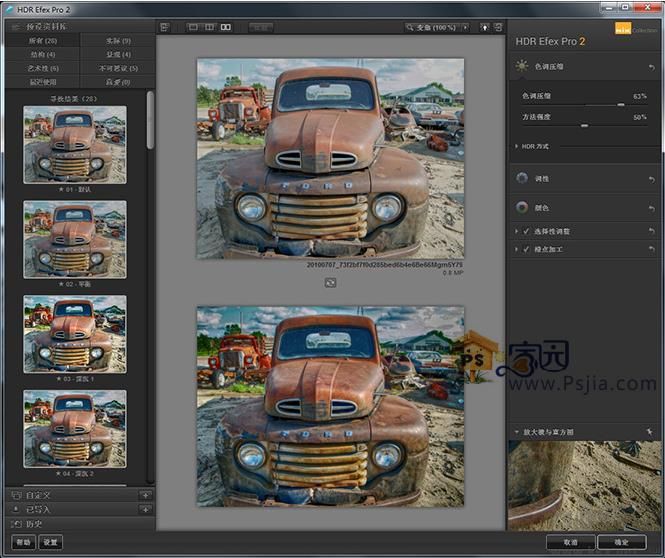HDR efex pro已經(jīng)內(nèi)置33種HDR效果,并且也可以自己在右側(cè)進行HDR細(xì)節(jié)微調(diào)