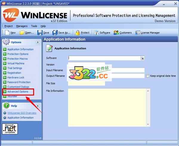 1、打開(kāi)“WinLicense.exe”然后點(diǎn)擊Adcanced Options