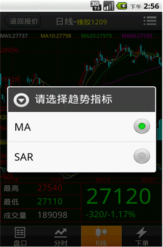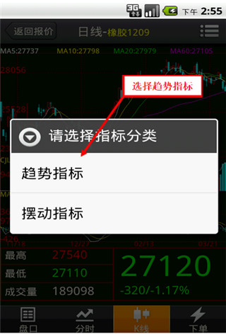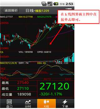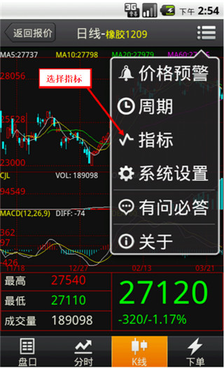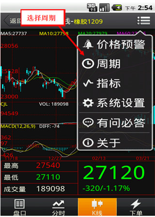 在k線圖界面點擊標題欄右側(cè)的菜單按鈕。如下圖