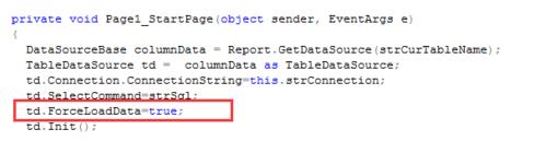 5、這時(shí)我們?cè)讷@取數(shù)據(jù)表,并自定義綁定數(shù)據(jù)連接和過濾條件后,進(jìn)行初始化之前就需要設(shè)置表格的ForceLoadData屬性為true