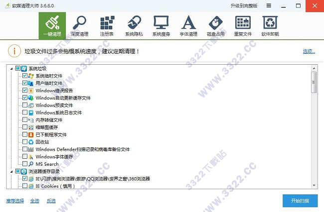 可清理系統(tǒng)垃圾、瀏覽器緩存目錄、視頻播放緩存目錄及常用軟件緩存等垃圾信息