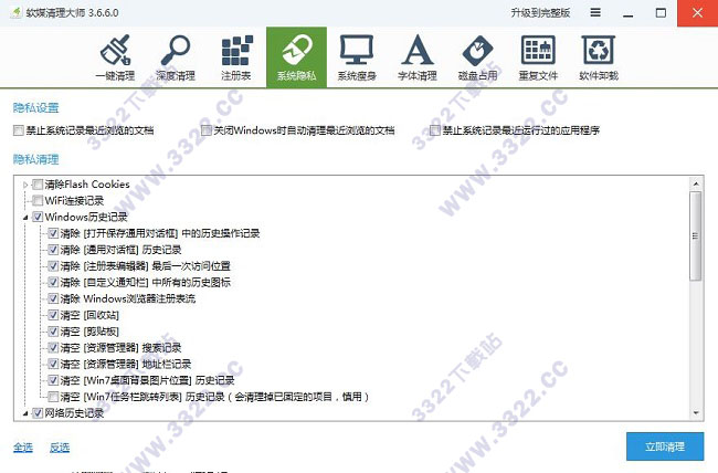 可進(jìn)行隱私權(quán)限,包括禁止系統(tǒng)記錄最新瀏覽的文檔、關(guān)閉Windows時(shí)自動(dòng)清理最近瀏覽的文檔、禁止系統(tǒng)記錄最近運(yùn)行過(guò)的應(yīng)用程序,并可進(jìn)行隱私清理,如清除Flash Cookies、清除WWindows歷史記錄、清除網(wǎng)絡(luò)歷史記錄等信息