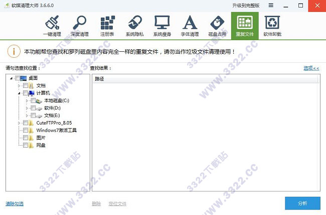 該功能可幫您查找和羅列磁盤(pán)空間里內(nèi)容完全一樣的重復(fù)文件,但查找時(shí)會(huì)自動(dòng)繞過(guò)WIndows系統(tǒng)相關(guān)的文件夾,同時(shí)特別提醒您該功能并不屬于垃圾文件清理,因此很多重要文件可能是一些有用的備份,建議您在進(jìn)行文件刪除時(shí)進(jìn)行下確認(rèn)