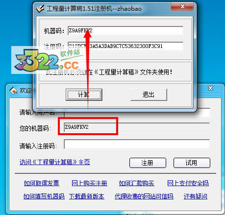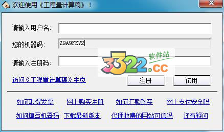 2、安裝完成,雙擊桌面上的“工程量計算稿”快捷方式,彈出注冊窗口,復制機器碼,暫時放置一邊,如kkx分享的圖所示: