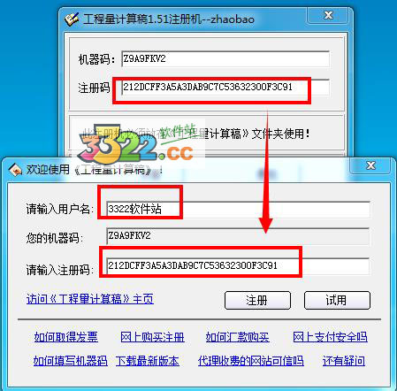 4、將得到注冊碼復制到注冊窗口中的“請輸入注冊碼”欄中,并輸入用戶名(可隨意輸入,如3322軟件站),完成輸入點擊注冊,如kkx分享的圖所示: