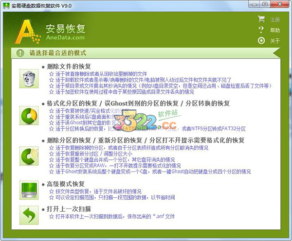 首先要選擇數(shù)據(jù)掃描的模式。根據(jù)常見的文件丟失情況,提供了“刪除文件的恢復”、“格式化分區(qū)的恢復/誤Ghost到別的分區(qū)的恢復/分區(qū)轉換的恢復”、“刪除分區(qū)的恢復/重新分區(qū)的恢復/分區(qū)打不開提示需要格式化的恢復”和“高級模式恢復”以及“打開上一次掃描”等5個功能模塊。