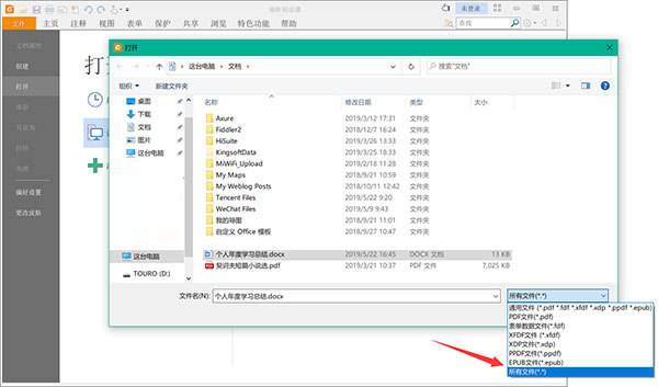 2、在格式范圍里選擇“所有文件”,彈出包括Word文檔在內(nèi)的所有文件,點(diǎn)選需要轉(zhuǎn)換成PDF的Word文檔,之后點(diǎn)擊“打開(kāi)”。