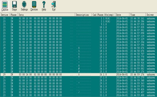1)設(shè)備列設(shè)備ID,每個設(shè)備分配了一個數(shù)字,第1個設(shè)備從0開始,第2個設(shè)備為1,依此類推,這項(xiàng)功能對于軟件同時捕獲多個并行設(shè)備非常有用,設(shè)備的ID分配在Device窗口中完成. 對于USB設(shè)備,設(shè)備的端點(diǎn)同時顯示出來(例如4.1表示ID為4的設(shè)備的1號端點(diǎn))