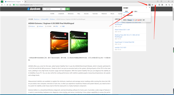6、點(diǎn)擊右上角的設(shè)置標(biāo)簽,點(diǎn)擊網(wǎng)頁(yè)翻譯,它會(huì)出現(xiàn)翻譯圖標(biāo),點(diǎn)擊圖標(biāo),即可出現(xiàn)英文和中文,直接點(diǎn)擊中文