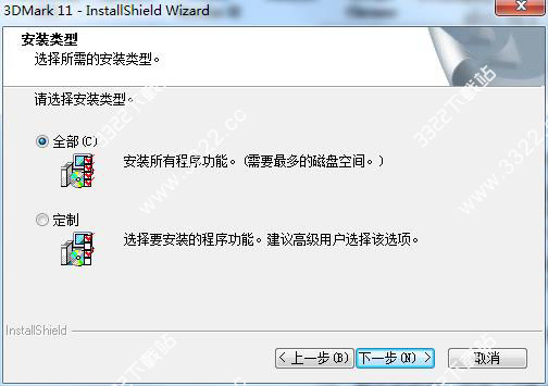 5、選擇3dmark11的安裝類型,建議勾選“全部”即安裝所有程序功能,當(dāng)然若高級(jí)用戶則可點(diǎn)擊“定制”自定義安裝的路徑和功能,如kkx分享的截圖: